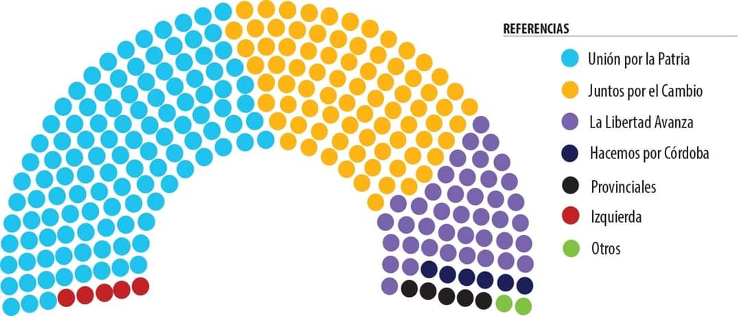 Las elecciones de este domingo en todo el país no solo sirvieron para que la ciudadanía elija a su próximo Presidente y Vicepresidente, sino también se votó para renovar 130 escaños en la Cámara de Diputados y 24 en el Senado. Con casi el 99% de las mesas escrutadas, a partir del 10 de diciembre existirá una nueva conformación en ambos recinto. Representación actual de la Cámara de Diputados (se necesitan 129 legisladores para que exista quorum) -Unión por la Patria : 118 -Juntos por el Cambio : 117 -Fuerzas provinciales : 15 -Izquierda : 4 -La Libertad Avanza : 3 Nueva conformación a partir de diciembre: -Unión por la Patria: 107 -Juntos por el Cambio : 93 -La Libertad Avanza : 37 -Fuerzas provinciales : 15 -Izquierda : 5 La nueva redistribución de legisladores nacionales muestra un aumento exponencial de los libertarios y la pérdida de diputados tanto para el actual oficialismo como para la coalición cambiemista. Por otro lado, en la Cámara baja también habrá importantes movimientos a partir del 10 de diciembre. LLA consigue sumar representación en el Senado mientras que JxC pierde casi 10 lugares. UxP suma tres escaño y quedó muy cerca de obtener quorum propio (es necesario 37). Representación actual del Senado: -Juntos por el Cambio : 33 -Unión por la Patria : 31 -Fuerzas provinciales : 8 Nueva conformación a partir de diciembre: -Unión por la Patria : 34 -Juntos por el Cambio : 24 -La Libertad Avanza : 8 -Fuerzas provinciales : 6 Fuente Diario Chaco.