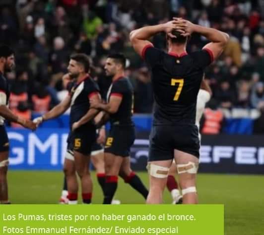 Ya desde el minuto de juego comenzó a verse el equipo de la primera fase más que el de cuartos de final, el que le ganó a Gales, con su mejor versión en el ST (29-17, con parcial 23-7 en los últimos 40’). Algunas discutibles decisiones y muchos errores de pérdida de pelota para que Inglaterra aplicara su especialidad: además de patear a cargar todo el tiempo, cambiar yerros ajenos por puntos propios. Por ejemplo, al 1m20’, Cubelli cometió penal y Farrell marcó los primeros 3. A los 7’, luego de una mala conexión de Isa y Rubiolo, los ingleses recuperaron la pelota y terminaron apoyando el try de Earls, que se filtró entre Cubelli y González (error de la marca). Los Pumas se despidieron del Mundial con un 4° puesto. Fotos Emmanuel Fernández/ Enviado especial Los Pumas se despidieron del Mundial con un 4° puesto. Fotos Emmanuel Fernández/ Enviado especial A los 11, de un line propio y descontrolado que manoteó Petti, llegó otro penal que Farrell no desperdició. A los 12’ Inglaterra, con el 59% de posesión, se imponía 13-0 ante unos argentinos que no honraban sus declaraciones asegurando un hambre y capacidad óptimas para ir por la medalla. Habían entrado fríos, como la noche en París, ya sin lluvia pero con 11 grados complicados. Si bien Los Pumas siguieron en esa senda de imprecisiones, al menos pelearon el control de la bola porque levantaron los forwards. González agarró la bandera con un robo de line y sus corridas; De la Fuente se contagió y, con su presión solitaria en el ruck frente al fullback Smith provocó el penal que Boffelli transformó en los primeros porotos nacionales. Como en la fase inicial (Inglaterra, Samoa y hasta Japón), la Selección había dispuesto de una ocasión anterior para pedir palos pero fue al line y la terminó perdiendo, incluso tras contar con un scrum. Al menos Los Pumas atacaban. Sin embargo, no aprovecharon el momento porque Kremer perdió una nueva pelota, que derivó en el cuarto envío adentro para Farrell. Aunque antes de que terminara la etapa, una jugada que arrancó con un buen tándem Mallía-Boffelli por derecha, fue a la izquierda para una nueva corrida de González. Se armó el continuado y ya, cerca del ingoal, Cubelli amagó a pasarla pero se estiró él y anotó. No era malo el 10-16 al descanso. Sobre todo por el inicio del ST. Al revés del PT, Youngs se equivocó y le regaló un line a Los Pumas. De la hilera salió la jugada que, vivo, Santiago Carreras, al ver que enfrente tenía al hooker (Dan) y a un pilar (Genge), los encaró y pasó como poste para armar su mejor maniobra (try) como 10 en el Mundial. Lo malo es que después la embarró al sacar un kick anunciado que le tapó el hooker inglés, para cobrársela con otro try. Así seguían iguales. El marcador se alteró con un penal de Boffelli a los 9’ pero, como se dice en el fútbol, después comenzaron a prestarse la pelota. Literalmente a las patadas. Nadie se animaba a tomar el partido por el cuello, ambos se equivocaban, y así no pasaba nada. Sí, los cambios en los dos equipos. Tras otro error de Carreras (dejó adentro la pelota en un penal a favor), ingresó Sánchez; también Creevy por Montoya. El hooker, al menos, tenía su despedida mundialista (récord argentino con 22 partidos por Copas con 25’), aunque no de Los Pumas, a los 38 años, marca global con 108 tests.. Farrell y Sánchez (llegó a los 902 tantos en Los Pumas, único que pasó la barrera de los 900) intercambiaron penales para que el partido siguiera apretado, 26-23 a favor de los ingleses. Faltaban diez minutos sin un claro dominador. A los 72’, el DJ del estadio levantó a los argentinos con el “Maradó” de Rodrigo. Pero para emparejar, después puso un tema de las Spice Girls. Había 77.674 personas en el estadio, algunas con ganas de bailar; la mayoría, nerviosas por el desenlace. Los chicos argentinos quedaron destruidos por no llegar al objetivo del día. Fotos Emmanuel Fernández/ Enviado especial Los chicos argentinos quedaron destruidos por no llegar al objetivo del día. Fotos Emmanuel Fernández/ Enviado especial Mateo Carreras no lo estaba, y petiso como es, sentó de traste a Smith para que la jugada terminara en el penal del empate, pero Sánchez le erró por el primer palo. Mientras tanto, Mallía (había quedado como capitán) sufría calambres o vaya uno a saber qué. Al equipo no le sobraba nada, menos los minutos… Quedaban 3 y, si bien se atacaba, Bazán Vélez cometió knock on para que la esperanza se fuera diluyendo. Si bien se había mejorado en el ST, el envión no alcanzó para colgarse la medalla. El bronce quedó para Inglaterra. Fuente Olé.