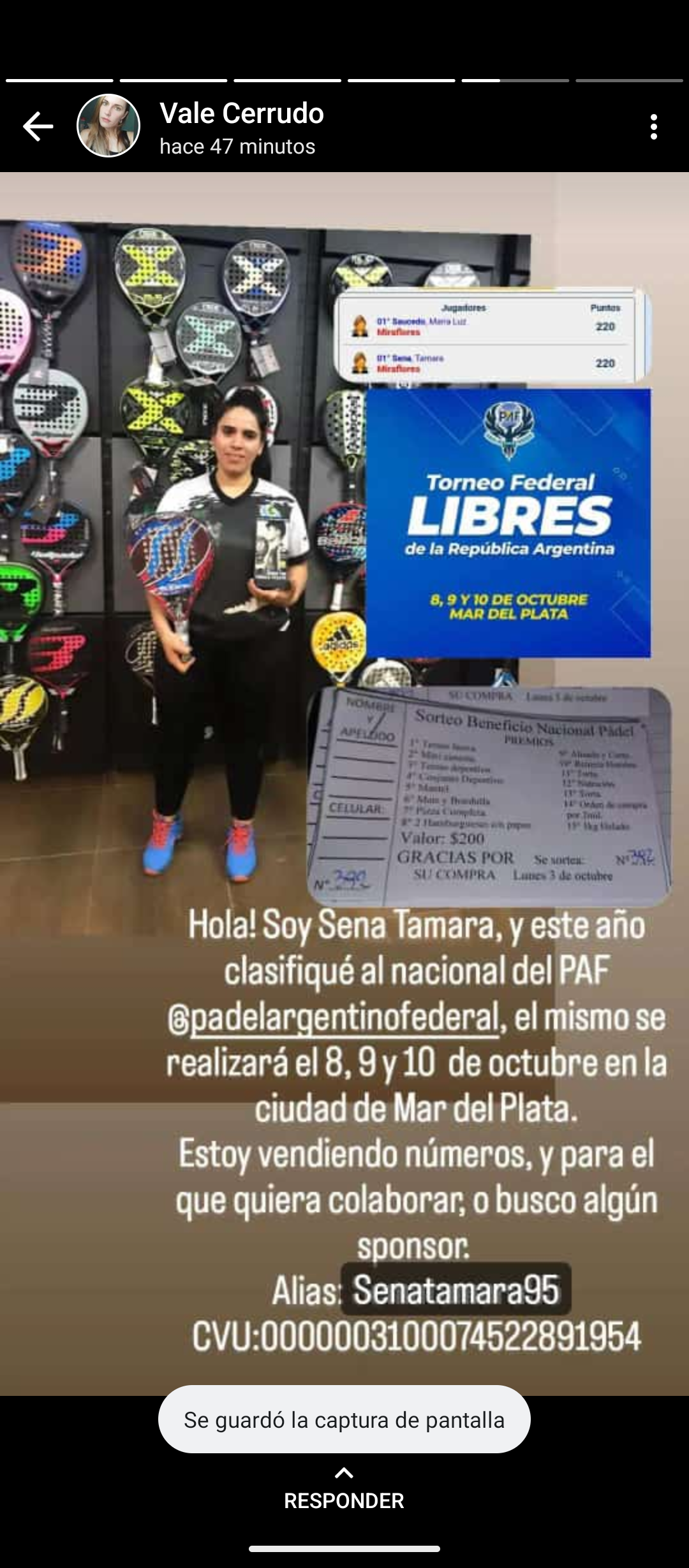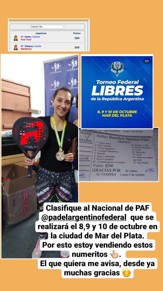 Por medio de estados de WhatsApp, las jugadoras de padel de la localidad de Miraflores Valeria Cerrado, Tamara Sena y Claudia Villagrán están solicitando sponsor y colaboración, para poder participar del Torneo Federal Argentino de Padel que se estará disputando en la ciudad de Mar del Plata el próximo 8,9 y 10 de octubre. A los ciudadanos que quieran colaborar pueden comprar números para una rifa solidaria. Apoyemos a nuestros deportistas locales. Sigamos poniendo a nuestra localidad en lo más alto. 💪💪💪