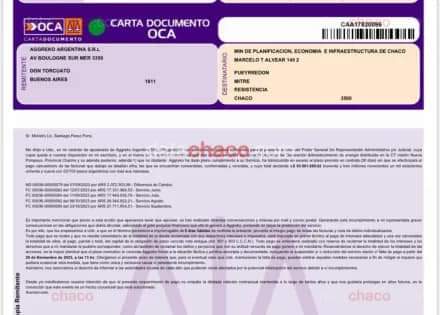 En la carta documento, a la que tuvo acceso DataChaco, la compañÃa con sede en la localidad bonaerense de Don Torcuato, se dirige al ministro Santiago Pérez Pons, a quien le reclama un total de $93.901.689,02 más intereses, por deuda de cinco facturas (cuatro por los meses de junio, julio, agosto y septiembre, y una más por "difrencia de cambio").