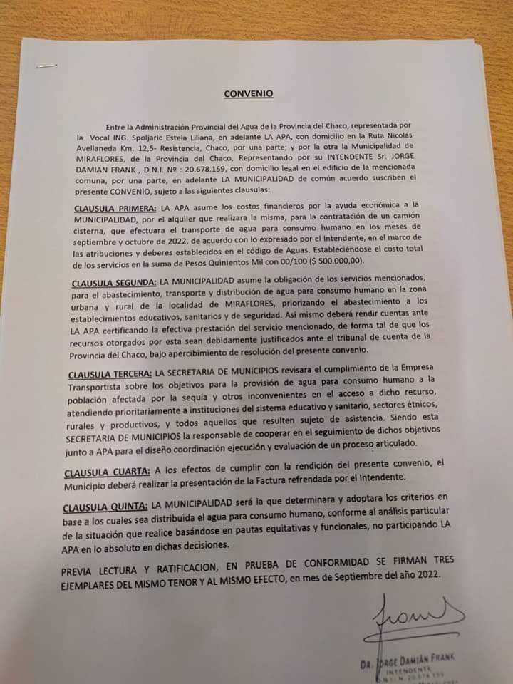 EL INTENDENTE DE MIRAFLORES JORGE FRANK FIRMÓ EL CONVENIO CON A.P.A PARA LA DISTRIBUCIÓN DE AGUA EN LA ZONA RURAL.