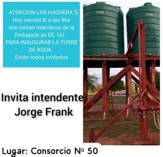 Con la gestión del Intendente actual, Dr Jorge Frank en conjunto con el secretario de Desarrollo Social, Ptor: Roberto Gil, el Sr Alejandro Mansfield, quien es presidente y creador de la Asociación Civil Solidaridad Cristiana, que se dedica a atender catástrofes naturales y la Embajada de Estados Unidos quienes realizaron la compra de los tanques, los cuales fueron donados al Municipio de Miraflores, este ultimo a través del jefe comunal se decide instalar los tanques en Las Hacheras. El Consorcio Caminero N° 50 de Las Hacheras hacheras sedió el espacio donde se realizo una perforación de la cual se obtiene el agua y en el mismo lugar se instalaron los tanques. La comunidad de Las Hacheras y zonas aledañas están todos invitado para la inauguración con la presencia del Intendente Dr Jorge Frank, el Sr: Alejandro Mansfield y representantes de la Embajada de los Estados Unidos. Fuente Pórtico Multimedios