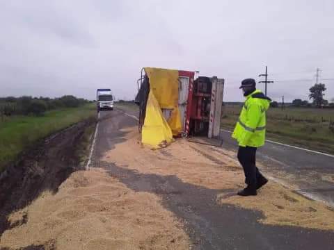 El camión, junto con su acoplado, volcó y quedó sobre la cinta asfáltica, provocando el derrame de parte de la carga de soja. Como resultado, se tuvo que interrumpir el tránsito vehicular en ambos carriles de la ruta.
