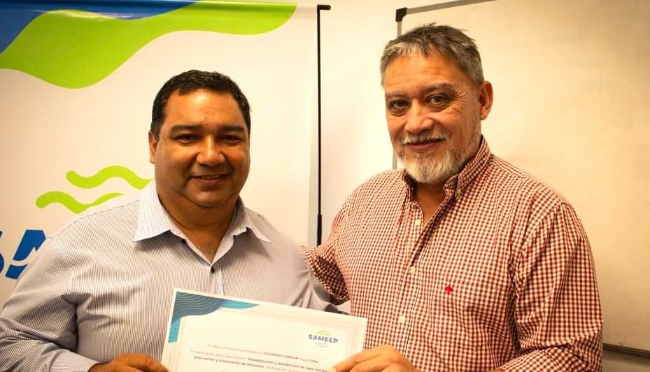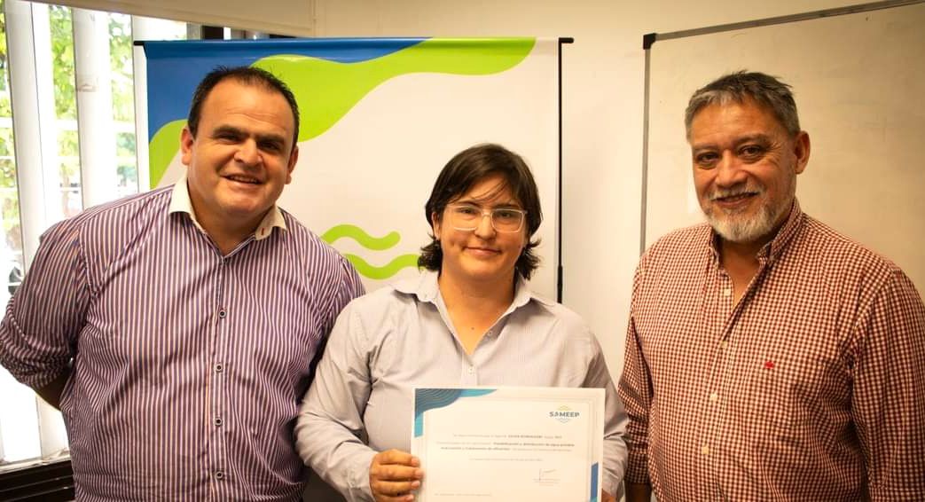 Con la entrega de certificados a pasantes y agentes que desarrollan actividades en la empresa, Sameep terminó un ciclo de capacitaciones en la que se abordaron temas como potabilización, distribución de agua potable y tratamiento de efluentes.* De la entrega de certificados, que se desarrolló en el Salón de reuniones de Sameep, participaron el vocal Rubén Hernán Custiniano, el gerente general, Edgardo Altamirano y el gerente de Servicios, Aníbal Aquino.