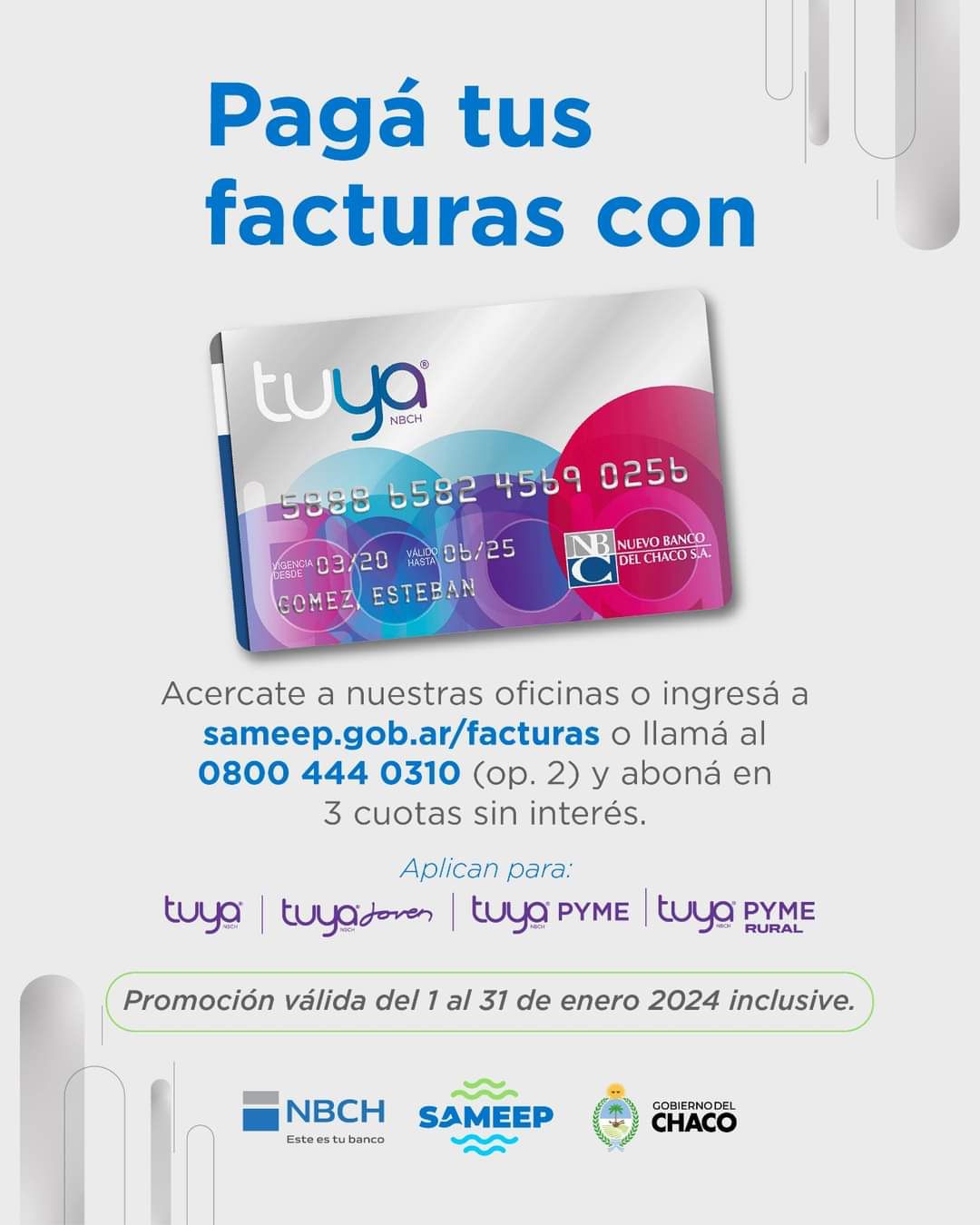 Para esta promoción aplican Tarjeta Tuya, Tuya Joven, Tuya Pyme y Tuya Pyme Rural del Nuevo Banco del Chaco en 3 cuotas sin interés y para Tarjeta Naranja en 3 y 5 cuotas sin interés acercándose a las oficinas de la empresa o bien llamando al 0800-444-0310 (opción 2) para pago telefónico.En este sentido, los usuarios también pueden adherirse al débito automático con tarjeta de crédito y débito. Dentro de los medios de pago online las facturas pueden abonarse con crédito y débito desde la web ingresando a sameep.gob.ar/facturas o a través de homebanking, Mercado Pago o Pago Mis Cuentas. De forma presencial, pueden hacerlo en la Caja Municipal, Lotipago, Pago Fácil, Rapipago. Los horarios de atención en Resistencia, Av. 9 de Julio 788, es de lunes a viernes de 6.30 a 12.30hs y de 13.30 a 19. Para pagos y consultas se puede comunicar al: 0800-444-0310 o al WhatsApp 3624687626.