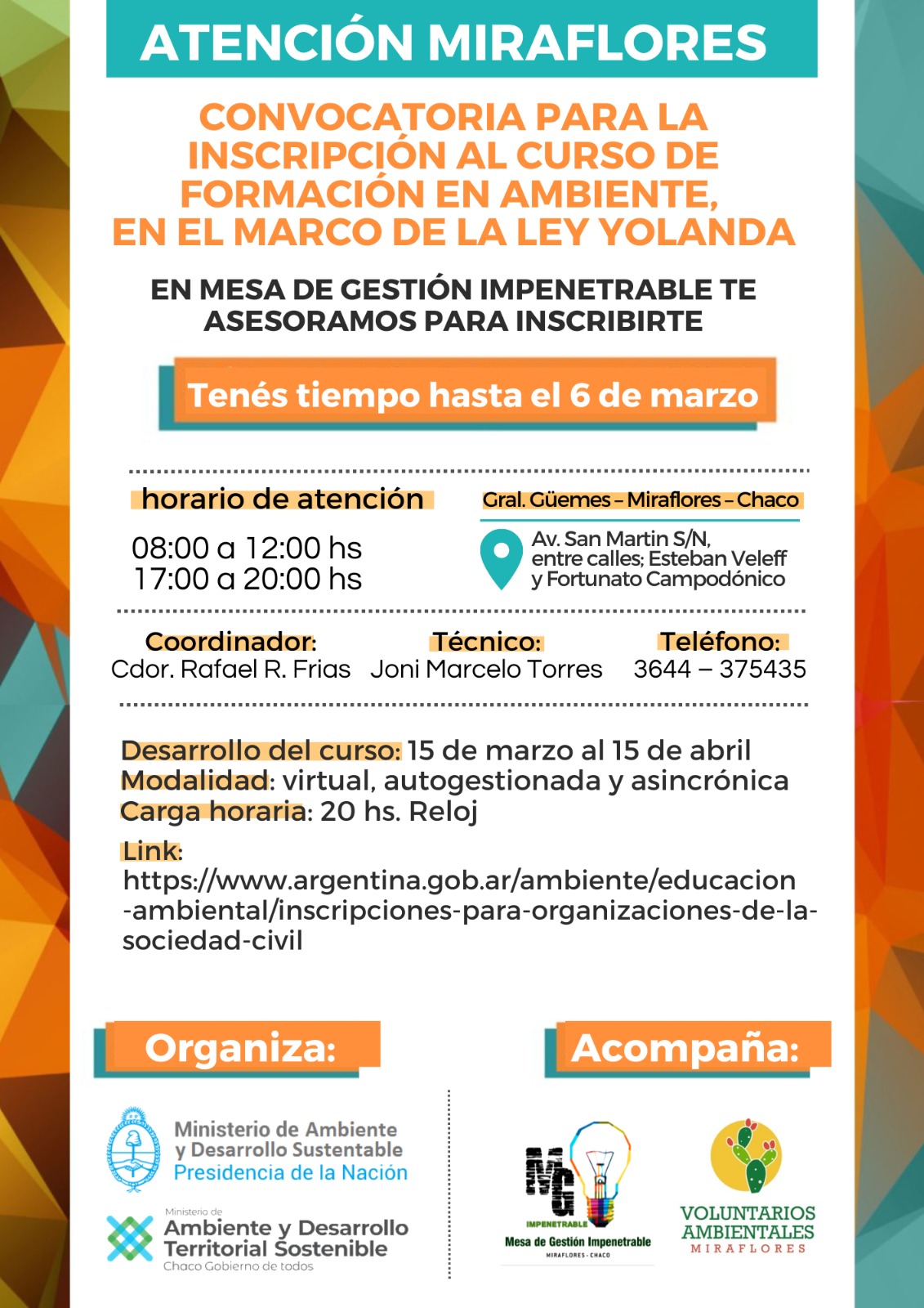 ✅ EN MESA DE GESTIÓN IMPENETRABLE TE ASESORAMOS PARA INSCRIBIRTE.🖥️📱 08:00Hs. A 12:00Hs. Y DE 17:00Hs. A 20:00Hs. 🔸 TENES TIEMPO HASTA EL 6 DE MARZO INCLUSIVE🔸 Desarrollo del curso: 15 de marzo al 15 de abril Modalidad: virtual, autogestionada y asincrónica Carga horaria:20 hs. Reloj Para más información, acércate a la oficina de mesa de gestión: 📍UBICACIÓN: Av. San Martin S/N, entre calles; Esteban Veleff y Fortunato Campodónico Dpto. Gral. Güemes – Miraflores – Chaco. O bien comunícate con el Tec. Joni Marcelo Torres al telefono 3644375435 *Más info 👇* https://m.facebook.com/story.php?story_fbid=pfbid02npxQE4MKH2rdpL24Q68zXiGVAfqJrc9gFHgyFHBpe4QPhhqqLCdanQKzAsSRRkxvl&id=100069123513481&mibextid=Nif5oz va