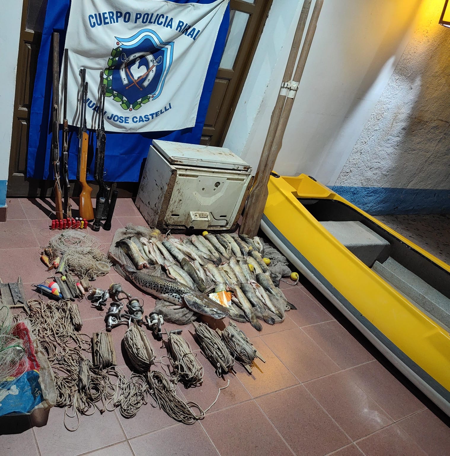 Personal destacado del Departamento Rural Juan José Castelli, prosiguiedo con tareas preventivas y recorridos permanentes en distintas colonias - parajes - rutas, llevando tranquilidad en la población ganadera. Momento circular sobre Ruta Provincial 9, interceptan paso (01) una Camioneta, marca Ford, modelo F100, color azul, teniendo enganchado un tráiler, color azul, guiado por M.A.S., (38), acompañado de F.G.J., (25), en requiza realizada por ruraleros constatan hallarían en presencia personas dedicadas actividad ílegal de caza y pesca, tal sentido los uniformados lograron SECUESTRO: *(21)* Cimbras, *(05)* Reels, *(03)* Señuelos *(01)* Red de pesca sabalera, *(12)* Piezas, especie tararira, *(01)* Pieza, especie surubí, *(01)* Conservadora, *(01)* Canobote, *(01)* Red, mojarrera, *(02)* Arma de fuego, tipo escopeta, calibre 12 y 16, *(01)* Aire comprimido, modificado a calibre 22, *(01)* Aire comprimido, 5.5, *(02)* Linternas, *(15)* Cartuchos calibre 12 *(01)* Cartucho calibre 16, sin documental alguna que respalde dicha actividad y portación arma fuego en cuestión; Actuación con intervención Dirección Fiscalización y Control ambiental (Fauna). Se notificó acta de infracción a la Ley N°1428-R y 1429-R, de Pesca y Caza.