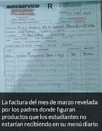 En este sentido, luego de realizar averiguaciones y cruzamientos de datos, revelan que en una de las facturas remitidas por el comercio proveedor, figuran 100 kilos de yerba Playadito, 330 kilos de azúcar, 130 kilos de banana, 130 kilos de manzana, 100 unidades de cacao por 800 gramos, 85 kilos de pera, 320 unidades de Té en saquito, 156 unidades de miel por medio kilo y 86 kilos de naranja.