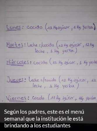 En la denuncia, manifiestan que la escuela N° 680 recibió en marzo un monto mensual superior al millón de pesos para el servicio de refrigerio de los estudiantes, pero que en la institución únicamente les dan mate cocido con pan los dÃas lunes, miércoles y viernes; mientras que los martes y jueves mate cocido con leche.