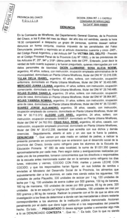 En concreto, lo que los padres denuncian es una supuesta trama fraudulenta para hacer figurar productos alimenticios contemplados en el plan nutricional establecido para las escuelas; pero que en la realidad solamente les estarÃan brindando un refrigerio mÃnimo basado en mate cocido con leche y pan.