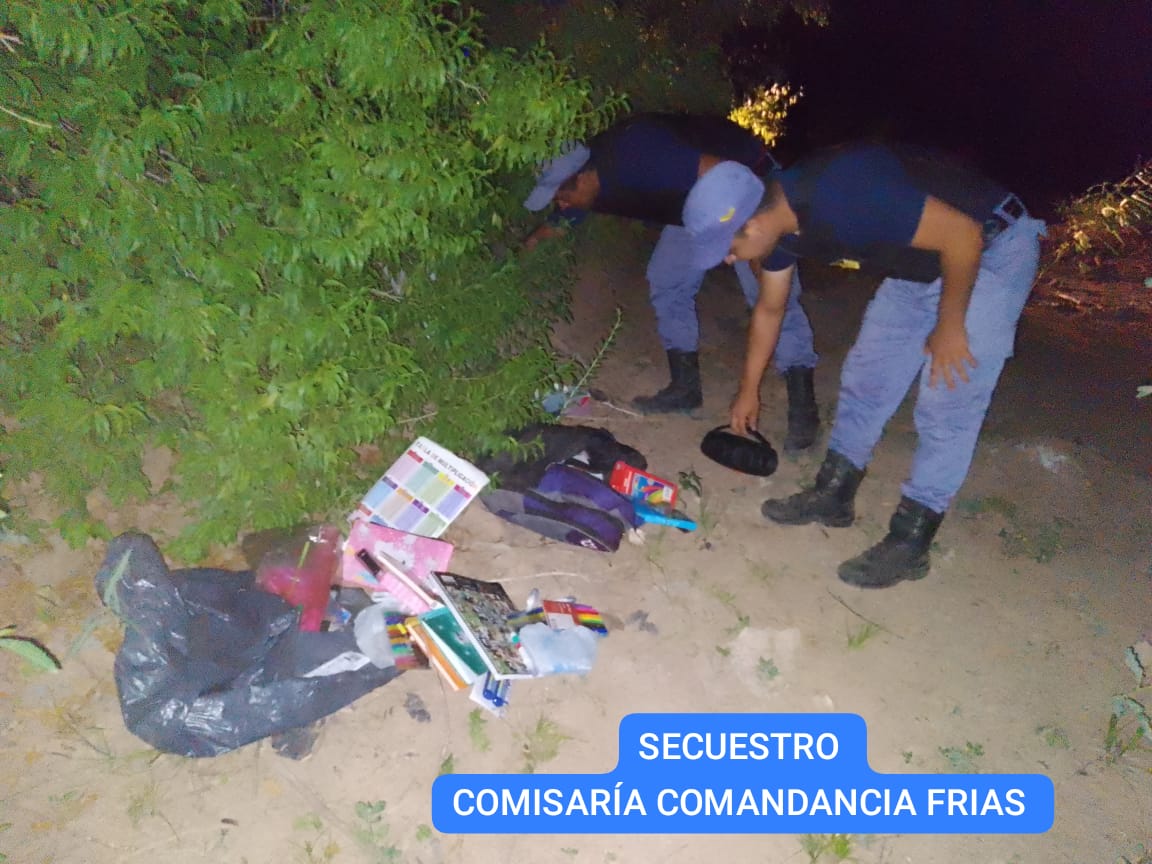 ✓ (01) Un parlante de música, Marca Titan de color negro ✓ (07) siete cuadernos de varios modelos ✓ (03) tres cuadernillos ✓ (04) cuatro cartucheras con útiles en su interior ✓ (01) Una caja de corrector ✓ (04) cuatro set de reglas ✓ (09) nueve juegos de biromes ✓ (10) diez set de fibras ✓ (10) diez cajas de lápices de color ✓ (10) diez marcadores ✓ (02) dos tijeras ✓ (01)Una caja de aros para carpeta ✓ (01) un par de zapatos, de color rojo; un reloj, de color marrón ✓ (01) un cargador de celular, de color blanco ✓ (01) una mochila de color gris, de marca Wilson ✓ (06) seis cajas de temperas ✓ una cantidad de $10.000 en efectivo, discriminados en billetes de $100 y $200. Ante tal Situación Personal policial acompañados por el jefe de ComisarÃa, tras tareas investigativas, y cruce de información, se logro saber que dichos elementos se encontrarÃan en zona orillas del rio bermejito, abandonados por personas desconocidas. Corroborado la información se procedió al formal secuestro de los artÃculos mención. Conforme dispuesto por magistrado actuante se hizo entrega del elemento a propietaria bajo respectiva acta. Informo el Of. Ppal. Pol. Gustavo CARBALLO - Jefe ComisarÃa Comandancia frias