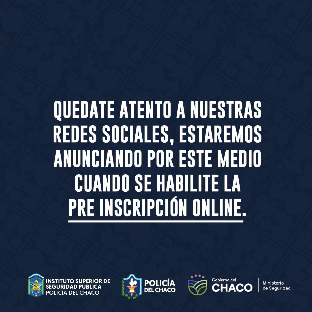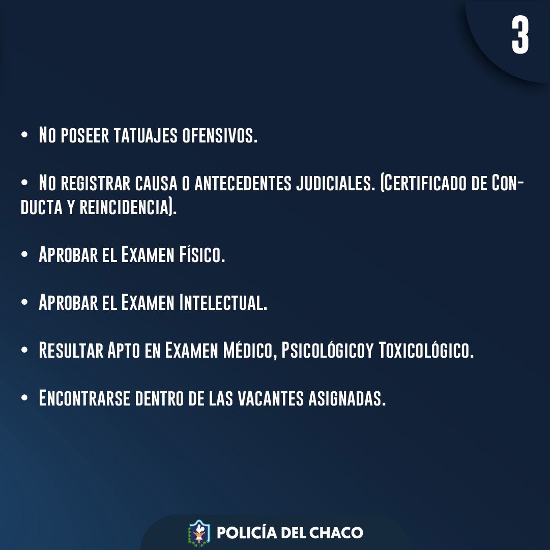 El gobierno de la provincia del Chaco, reitera la convocatoria para cubrir 400 vacantes en la fuerza, de las cuales 300 serán para cupo masculino, mientras que 100 serán para cubrir el cupo femenino.* Desde la Policía provincial, se conocieron los requisitos que deberán cumplir los interesados, mientras que en los próximos días, será informada la fecha de inicio de la preinscripción.