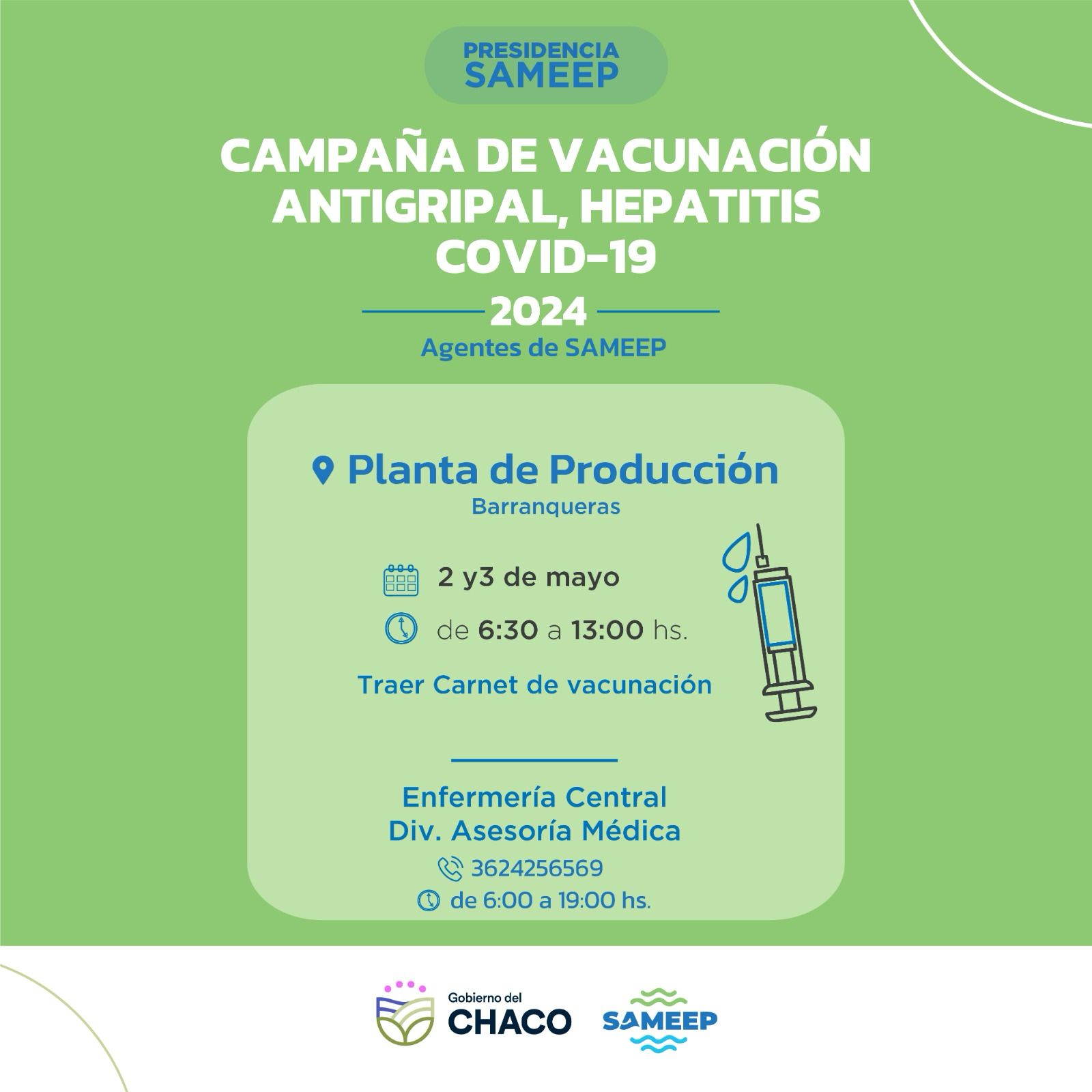 En el marco de la Campaña Antigripal 2024 que se lleva adelante en toda la provincia, el Directorio de Sameep pone a disposición de los empleados postas de vacunación ante los próximos meses de bajas temperaturas, y considerando además, las autoridades la importancia para llegar a la época invernal con el sistema inmunológico fortalecido.
