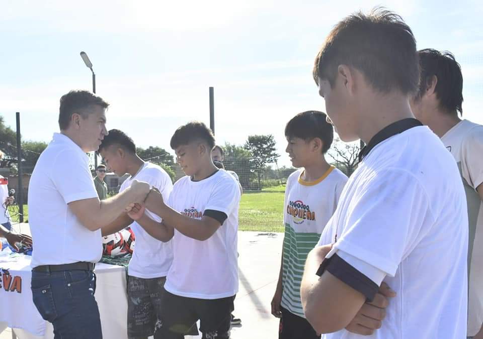El gobernador Leandro Zdero inauguró, este viernes en Presidencia Roca, un playón deportivo y entregó elementos e indumentaria deportiva. El espacio tiene como principal beneficiaria a la comunidad Qom que es la que, mayormente, habita el barrio San Juan. “Desde la gestión trabajamos para democratizar el deporte, para que llegue a cada barrio, a cada paraje de nuestra provincia”, aseguró el mandatario, acompañado por la vicegobernadora Silvina Schneider y el intendente Gustavo Martínez. En el playón se podrá practicar básquet, vóley, hockey, fútbol, entre otras disciplinas deportivas. “Que el deporte sea un punto de encuentro donde se recuperan valores como el respeto, la solidaridad y el compañerismo”, señaló Zdero e instó a cuidar el playón, “porque es fruto del esfuerzo de todos los chaqueños”. Estuvieron presentes, además, el presidente de Lotería Chaqueña, Lucas Apud; el presidente de APA Jorge Pilar, el vocal Luis Castagno; el presidente de Sameep, Nicolás Diez; la diputada provincial Dorys Arkwright; el referente del Deporte del Municipio Santiago Espínola, vecinos de la localidad. Espínola agradeció al gobernador “por la mirada especial puesta en el interior y en este día, en particular, a Presidencia Roca”.