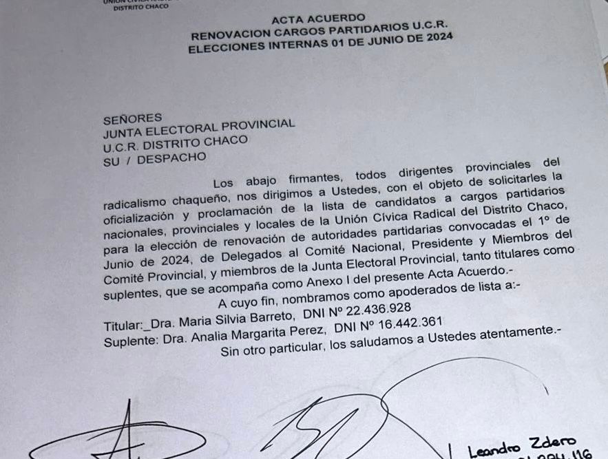 Este lunes, pasada la medianoche, se cumplió el plazo para la presentación de las listas en la UCR Chaco. El partido radical renovará sus autoridades el próximo 1 de junio, con mandato por 2 años y en ese sentido, todas las líneas internas coincidieron en *consolidar la UNIDAD llevando al actual gobernador Leandro Zdero como el nuevo presidente y líder de la UCR.