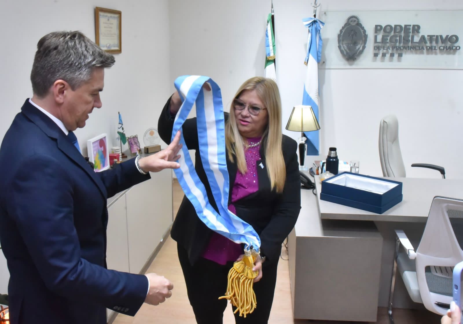 La presidente de la Legislatura, Carmen Delgado entregó al gobernador Zdero la Banda Gubernamental, la cual estrenará en el Acto Central del 25 de Mayo, en Pampa del Infierno.