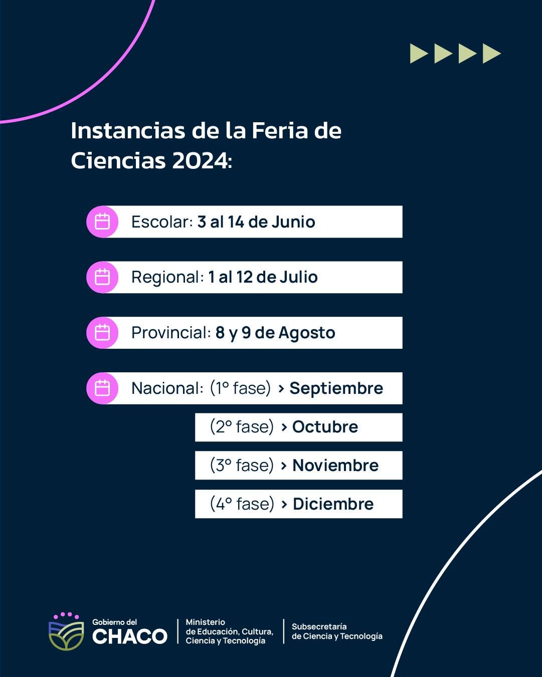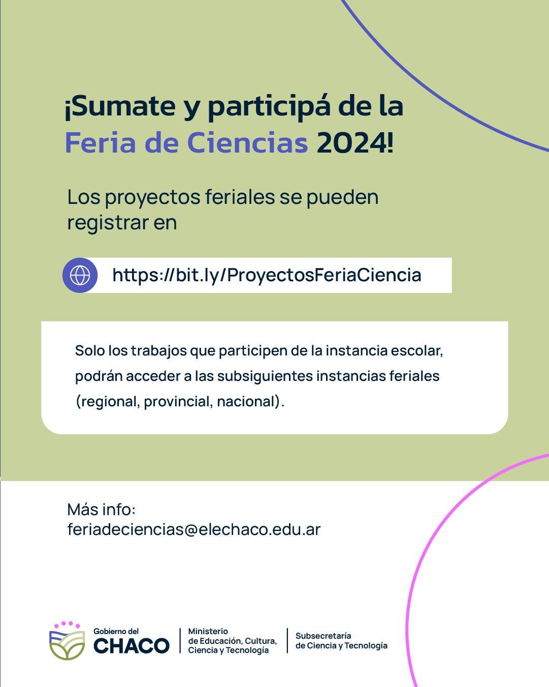 Desde la Subsecretaría de Ciencia y Tecnología del Ministerio de Educación se recuerda a las instituciones educativas que este domingo 2 de junio es el último día para la inscripción de proyectos para la Feria de Ciencias 2024. Las inscripciones se realizan a través del formulario online disponible en: https://bit.ly/ProyectosFeriaCiencia