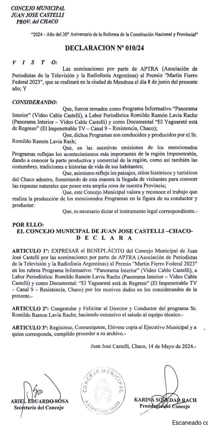 Mediante un beneplácito el Concejo deliberante local hizo mención a la trayectoria y destacada participación en los premios mayor a la radio y televisión de Argentina. El conductor y productor Romildo Lavia Rachz destacó el reconocimiento local en nombre de su equipo y familia que ya lleva más de 18 años apostando a la industria audiovisual junto a Video Cable Castelli, Canal 9 y Cadena Los Ángeles. Fuente: http://www.fmlosangeles.com.ar/