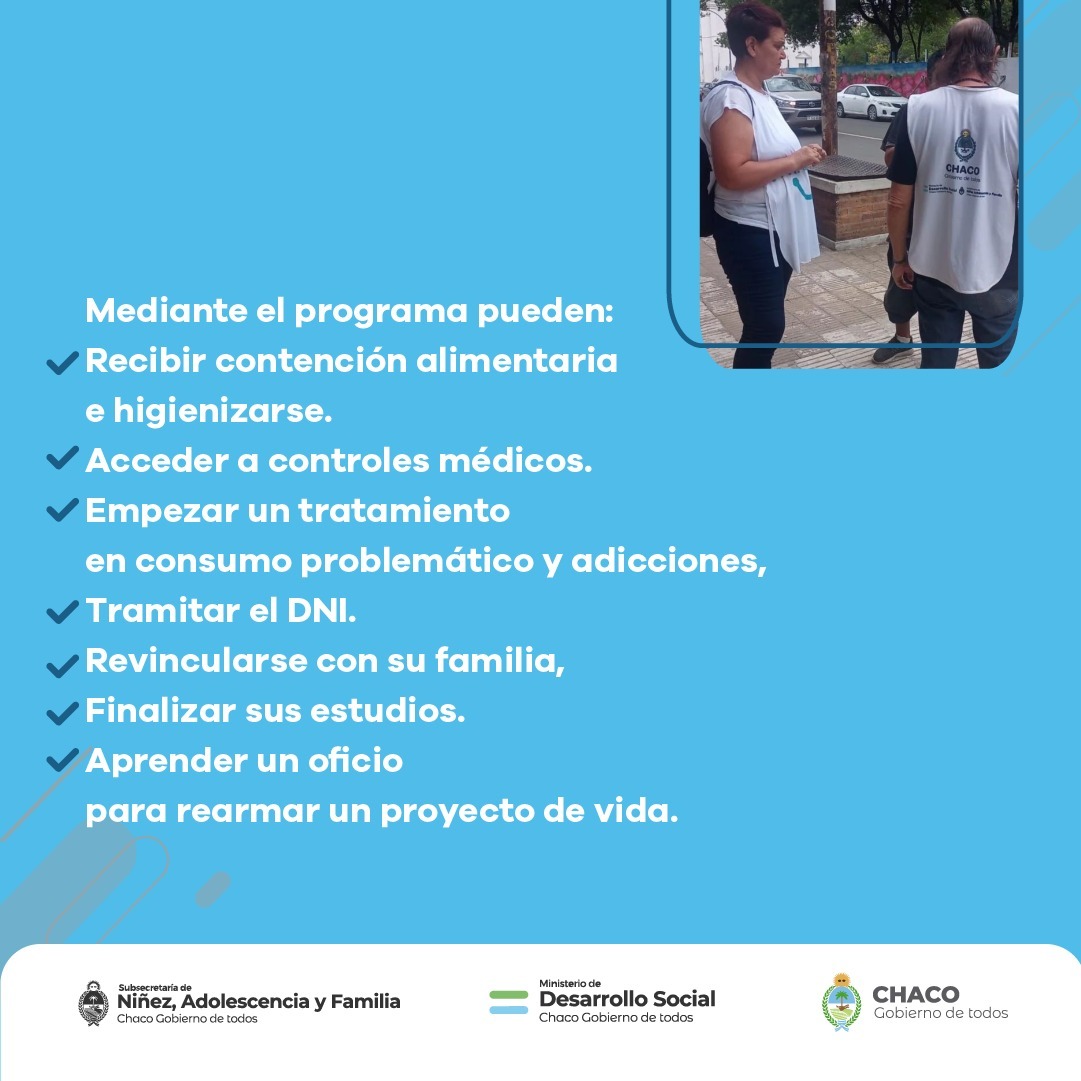 El programa cuenta con dispositivos de alojamiento transitorio para aquellas personas adultas que decidan libremente salir de la situación en la que se encuentran y también posee centros convivenciales para encarar un trabajo a mediano o largo plazos, lo que incluye que quienes llegan empezarán otros proyectos de vida. En primera instancia se realizan capacitaciones en oficios, controles sanitarios, tratamientos médicos y psicológicos para casos de consumos problemáticos, trámites para renovar el Documento Nacional de Identidad y acceso a terminar estudios primarios o medios.