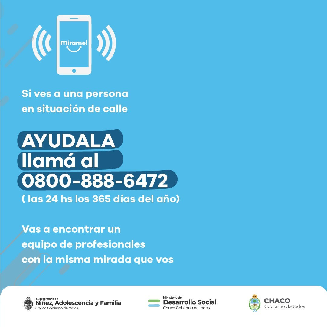 Mediante el programa Mirame, que pone en práctica la SubsecretarÃa de Niñez, Adolescencia y Familia del Ministerio de Desarrollo Social, se otorga atención inmediata a personas en situación de calle. Como acción de corresponsabilidad social, se pide a la ciudadanÃa alertar estos casos llamando al 0800-888-6472.