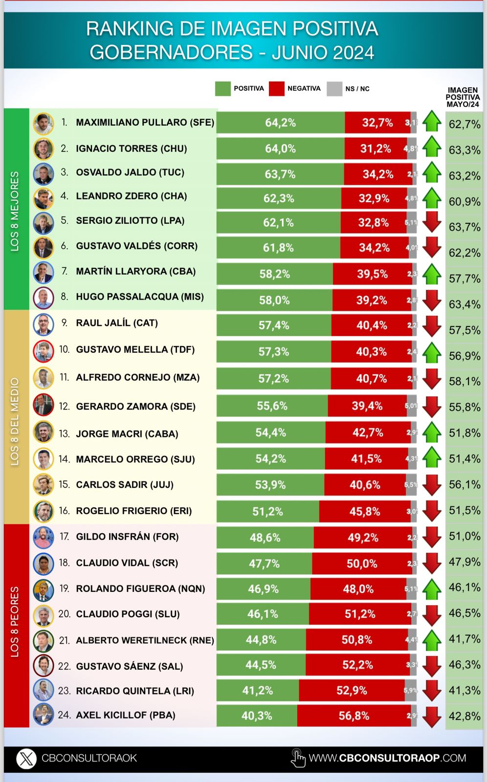 Según la consultora CB Opinión Pública, el mandatario chaqueño aparece ubicado en la cuarta posición. El ranking completo. El relevamiento en la provincia de Chaco se llevó a cabo del 1 al 4 de junio, abarcando un total de 937 casos. De las casi los 1.000 personas consultadas, un 26,8% indicó que tiene una imagen "muy buena" de Zdero y un 35,5% respondió "buena". En el lado contrario, 17,1% afirma que la imagen de Zdero es "mala" y un 15,8% "muy mala". Encuesta realizada por CB. En relación a otros primeros mandatarios, hubo varios movimientos llamativos con respecto al mes anterior. El gobernador de Misiones, Hugo Passalacqua, estaba en el segundo lugar con un 63,4% de imagen positiva en el mes de mayo y en esta nueva medición bajó hasta el octavo lugar. Sin lugar a dudas, el conflicto salarial que sucedió en su provincia, influyó. El jefe del Ejecutivo santafesino, Maximiliano Pullaro, es quien lidera el ranking este mes con una suba significativa de su imagen. Subió del quinto puesto al primero y su imagen subió en un 1,5%. LOS PRIMEROS En primer lugar se ubica el gobernador de Santa Fe, Maximiliano Pullaro, con un 64,2% de imagen positiva, lo sigue Ignacio Torres de Chubut con un 64% y tercero quedó el tucumano, Osvaldo Jaldo, con un 63,7%. LOS ÚLTIMOS En el otro lado del ranking están: Gustavo Sáenz (Salta) con un 52,2% de imagen negativa, Ricardo Quintela (La Rioja) con un 52,9% y en el último lugar está Axel Kiciloff (Provincia de Buenos Aires) con un 56,8%.