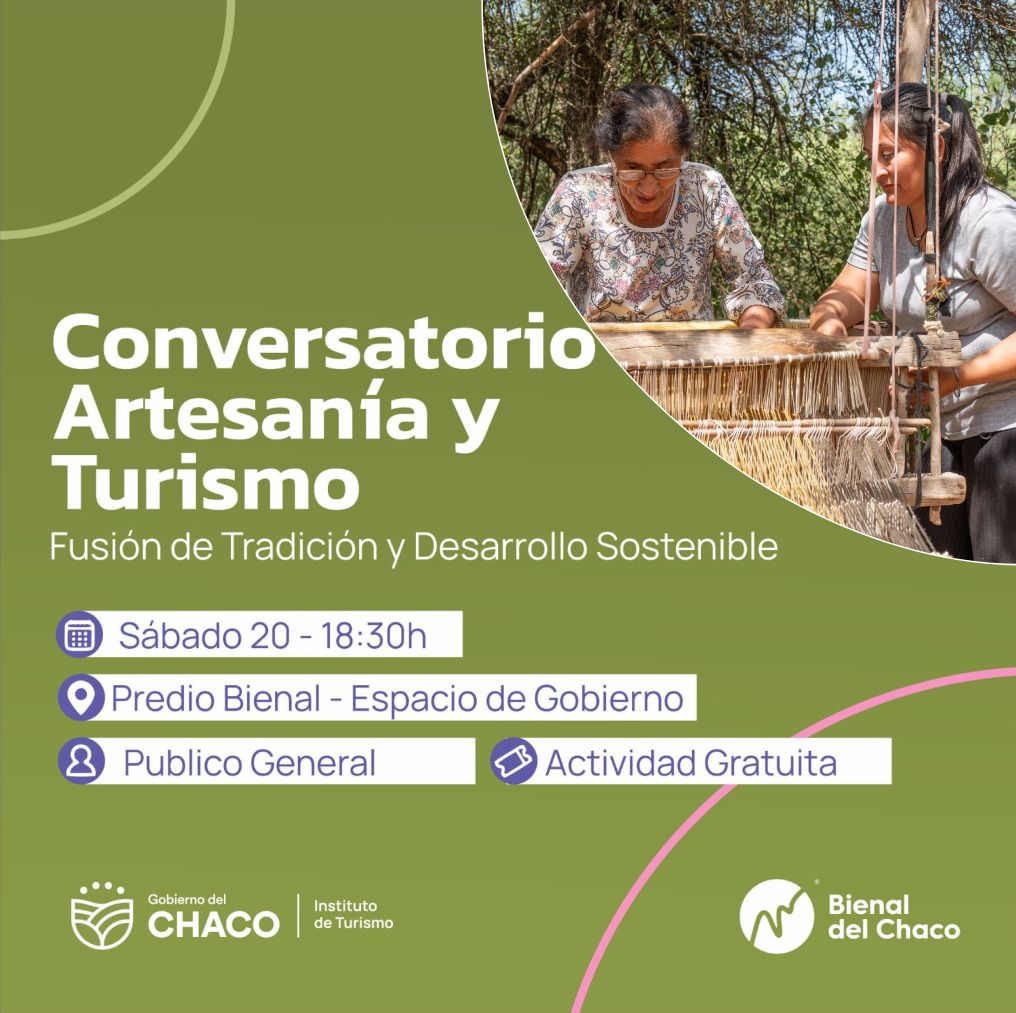 Se realizará un conversatorio centrado en la artesanÃa y el turismo, enfocado en las materias primas nativas del monte y la incorporación de nuevos materiales en las creaciones artesanales. Participarán artesanas destacadas como Veda Palavecino y Adela Ybañez del Impenetrable chaqueño, Magdalena Segovia del pueblo Moqoit de Villa Berthet, Victorina Leiva del Pueblo Qom de Miraflores, Jésica Chara, escultora alfarera del Pueblo Qom de Resistencia y Griselda Morales, artista de las artesanÃas, el canto y la danza Qom e integrante del Coro Qom