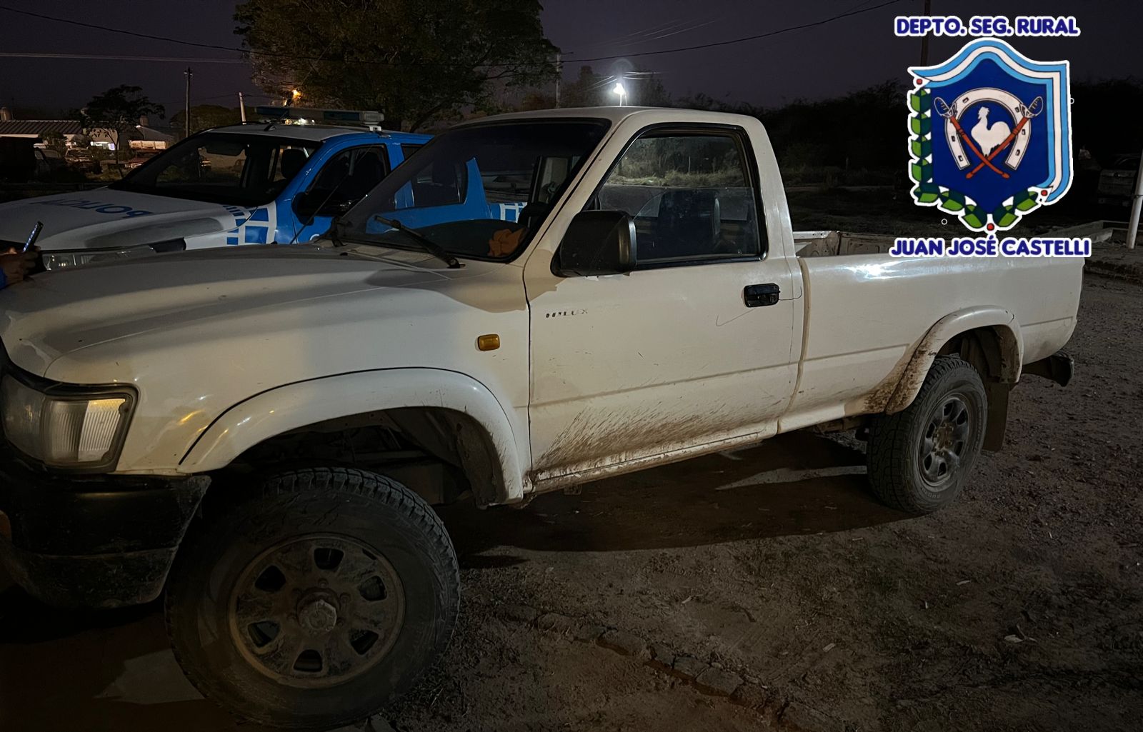 Los uniformados rurales momentos de estar llevando a cabo control vehicular en camino vecinal del Paraje Pampa Argentina - Castelli, interceptan el paso (01) Camioneta, marca Toyota, cabina simple, color blanco, dominio colocado, guiado por S. D., 36 años, acompañado de M. F., 49 años, solicitar documentaciones del rodado, conductor manifestó no poseer, momentos acompañante aduce que rodado pertenece al Ministerio de Educación Cultura Ciencia y Tecnología de la Provincia,