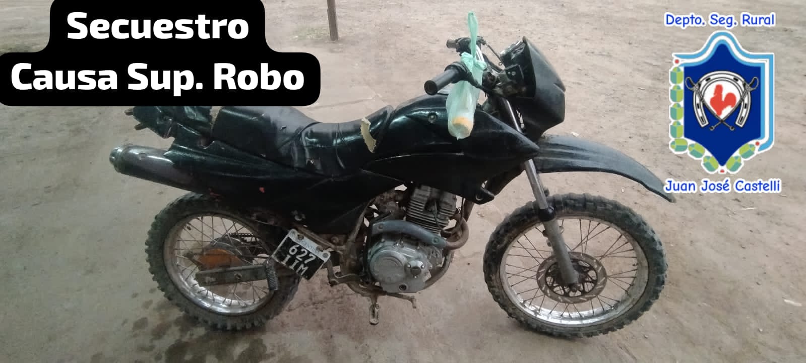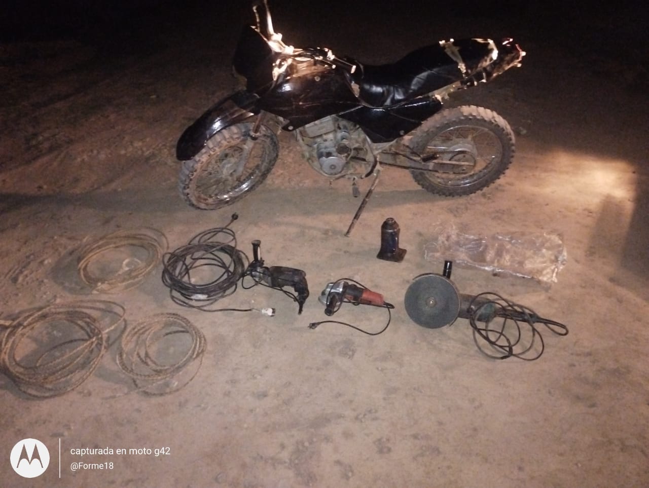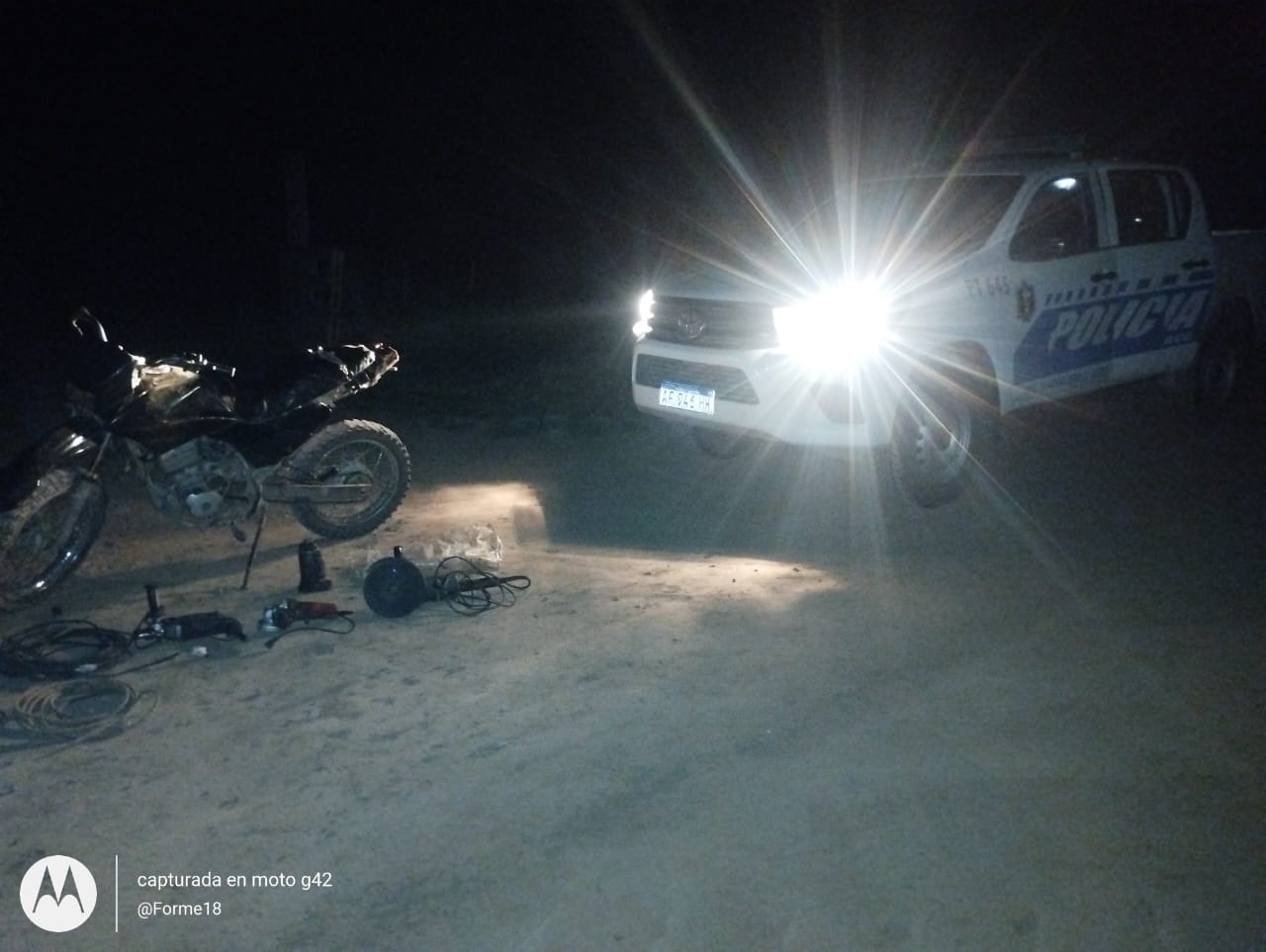 Durante la madrugada, cuando efectivos de la policia rural de juan jose castelli, efectuaban tareas de prevencion sobre zona rural, Pje. LA FLORIDA CHICA, interceptan el paso de una motocicletas tipo cross, color negro, a bordo de dos ocupantes identificados como C.A. 31 años y C.W. 24 años, ddo. Planta Urbana J.J. castelli, quienes tenían en su poder elementos sustraídos de manera ilegal.