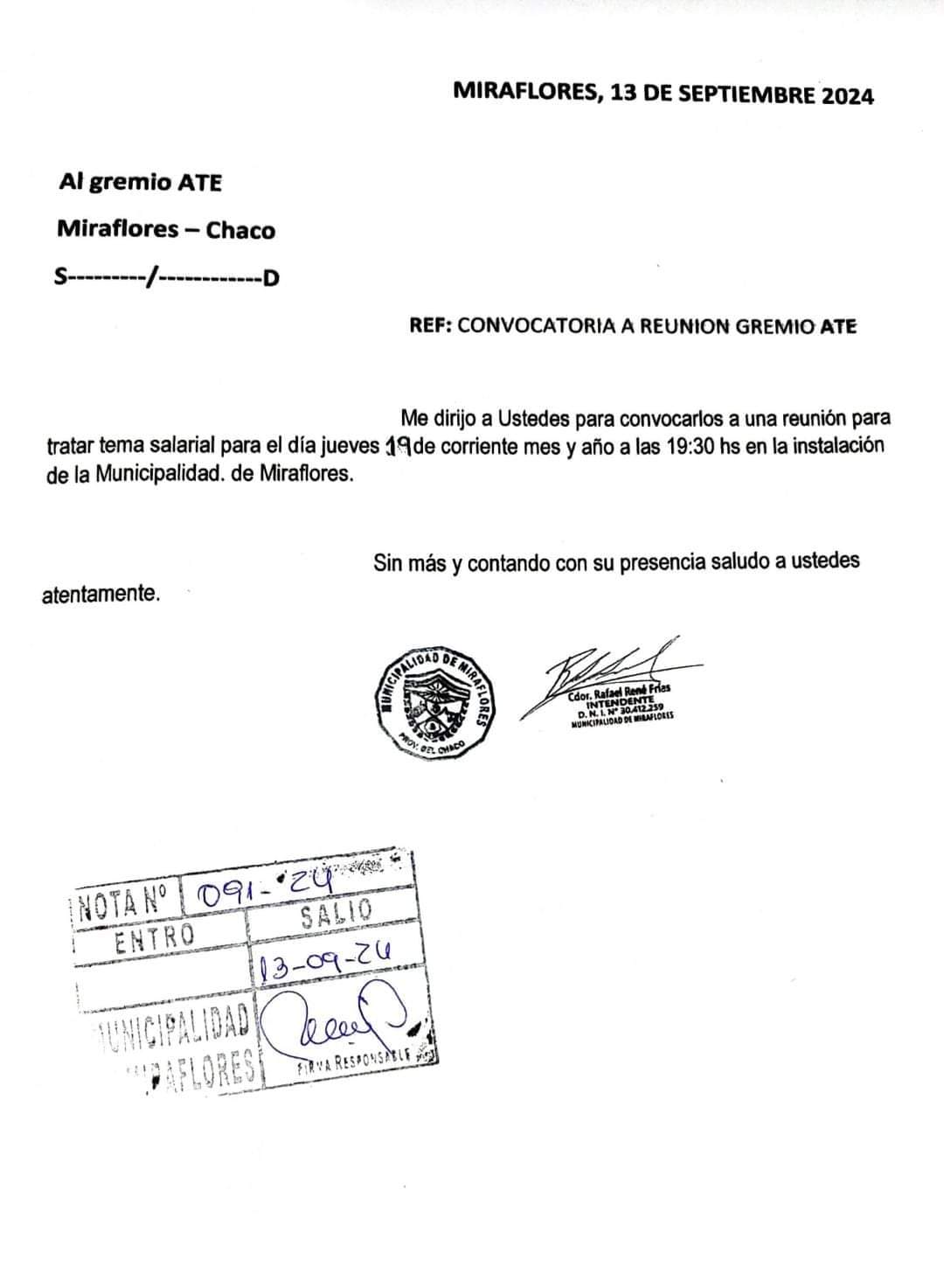En esa reunión, planteé recibir a los " delegados" de los sectores el viernes pasado, pero por motivos que fui convocado por los diputados del interbloque, al igual que todos los intendentes que integramos el foro de intendente de la provincia, a los fines de tratar la posiblidad de aprobación de un proyecto de ley para la toma de un crédito para la provincia para hacer frente la crisis energética. Tal es así, que el mismo viernes he mandado una nota convocando para el día Jueves 19 de Septiembre a las 19:30 hs. Por ello no entiendo el porqué de la toma del corralón, ya que hay voluntad de reunirnos y voluntad de llevar adelante un incremento salarial. En particular respecto al reclamo laboral de mí parte fueron cumplidas las formalidades, no puedo decir lo mismo de parte de aquellos trabajadores que tomaron esta decisión, comprendo pero no comparto y también quiero aclarar que son solo una parte de la planta municipal, valoro el esfuerzo de todos los demás trabajadores que entienden que la gente está cansada de este tipo de situaciones y que todos tenemos que poner el hombro por miraflores manifestó. además, el intendente expresó que cada uno puede tomar las medidas que crea que sea necesaria, pero que todo acto tiene sus consecuencias. Haciendo hincapié nuevamente que siempre estuvo dispuesto al diálogo como lo ha hecho a lo largo de la gestión.