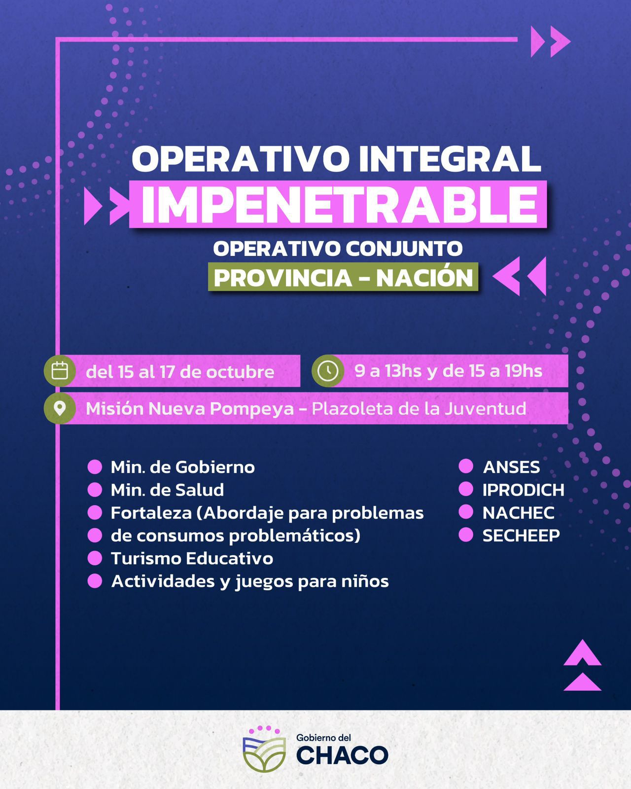 Operativo Impenetrable conjunto: Provincia-Nación De este modo el Gobierno provincial junto a Nación propiciará un acercamiento de los servicios y la asistencia en territorio de diferentes Ministerios y organismos autárquicos del Estado, a vecinos de El Impenetrable como ser: el Ministerio de Gobierno, Salud, Desarrollo Humano, ANSES, IPRODICH, SECHEEP y programas de asistencia como “Ñachec”, “Fortaleza, abordaje para problemas de consumos problemáticos”, Turismo Educativo, actividades y propuestas para niños. “Se vienen haciendo muchos operativos, desde el inicio de esta nueva gestión, asistiendo a los vecinos en los parajes con más salud, atención de trámites, alimentos y agua, entre tantas demandas de la zona” dijo Vogel. Por otra parte, el referente local sobre este nuevo operativo agregó: “Es un operativo conjunto entre la provincia y nación, con varias áreas del estado, son 3 días intensos en Nueva Pompeya y con el apoyo del intendente Vicente Gonzalez vamos a estar trabajando y acompañando con nuestros equipos desde Ñachec, desde el Ministerio de Desarrollo Humano”. Por último, agradeció “la mirada especial que tiene nuestro Gobernador Leandro Zdero hacia El Impenetrable y decirles que ya los facilitadores están compartiendo la información de que estaremos la semana que viene junto al Gobierno del Chaco y Nación en Misión Nueva Pompeya para atender a todos los parajes y localidades de nuestra región”.