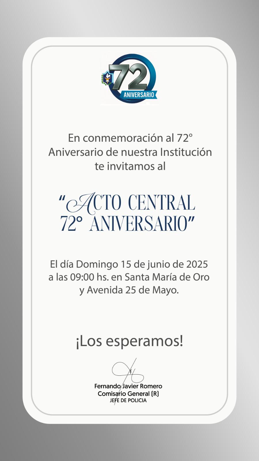 La Policía de la Provincia del Chaco tiene el honor de invitar a la comunidad en general a participar del acto conmemorativo por el 72º Aniversario de su creación, que se llevará a cabo el día domingo 15 de junio de 2025, a partir de las 09:00 horas, en la intersección de avenida Mitre y avenida 25 de Mayo, en la ciudad de Resistencia._ñ