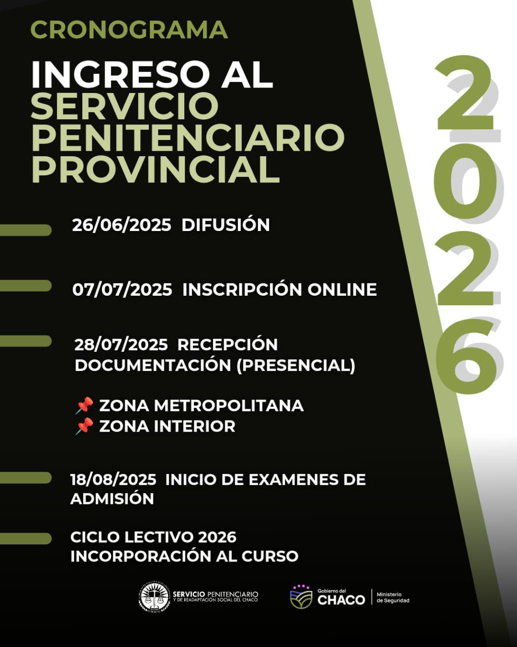El Servicio Penitenciario Provincial informa a la comunidad el cronograma correspondiente al proceso de incorporación al Ciclo Lectivo Año 2026, destinado a los aspirantes interesados en formar parte de la institución.