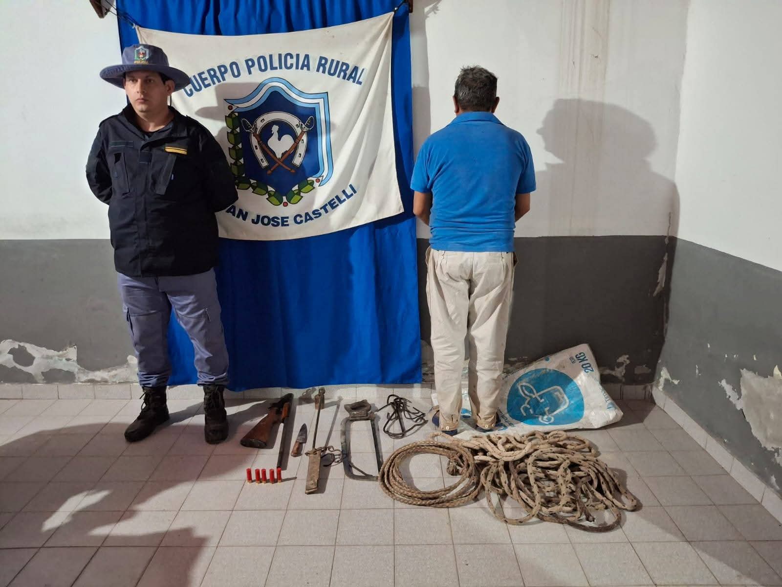 Seguidamente se realizó allanamiento en un campo lindante donde residiría tercer implicado, se procedió inspeccionar inmueble de una superficie de Cien hectáreas, donde se logró el hallazgo de elementos de interés para la causa, como ser: vestigios de faena, restos óseos, cuero animal vacuno coincidente con las características aportadas por el damnificado, sierra carnicera, ganchos, lazos y soga con manchas de sangre, armas de fuego, asimismo la conducción y aprehensión de tres ciudadanos mayores de edad implicados en el hecho quienes fueron notificados de su DETENCIÓN causa Supuesto Abigeato.