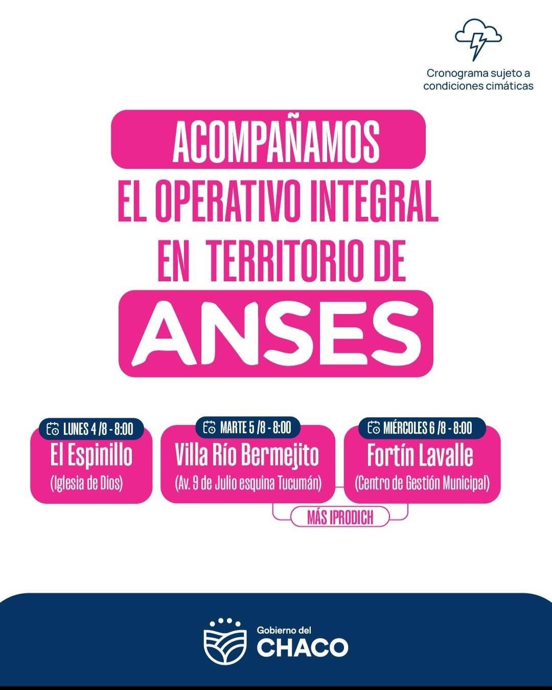 Será en El Espinillo, en Villa Río Bermejito y en Fortín Lavalle. En articulación con organismos nacionales y provinciales, el Ministerio de Desarrollo Humano junto a IPRODICH participarán del Operativo integral de ANSES que iniciará este lunes en El Impenetrable.