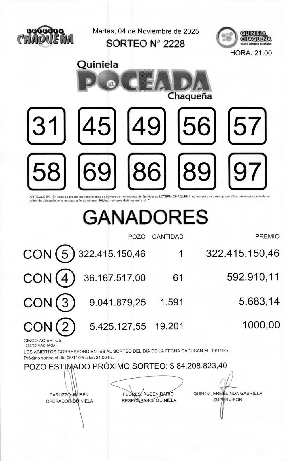 El sorteo de la Poceada Chaqueña de este martes 4 de noviembre dejó un nuevo millonario en Machagai. El premio total fue de $ 322.415.150.