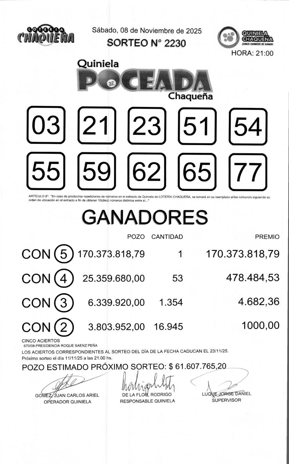 Un apostador ganó más de $ 170 millones con la Poceada Chaqueña. Oriundo de Sáenz Peña, el ganador se alzó con la millonaria suma tras acertar los cinco números correspondientes al sorteo N° 2230, realizado en la noche de este sábado.