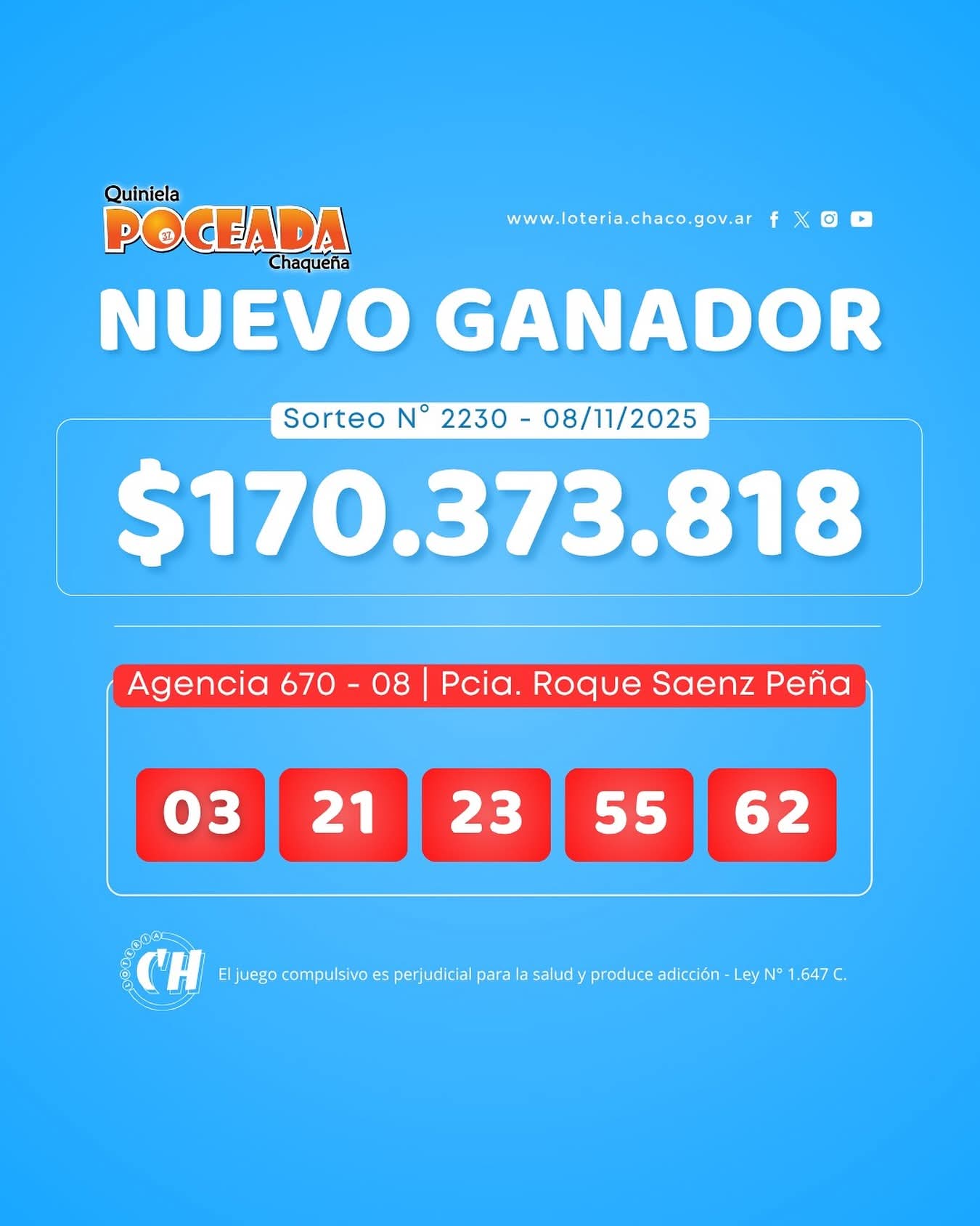 Un apostador ganó más de $ 170 millones con la Poceada Chaqueña. Oriundo de Sáenz Peña, el ganador se alzó con la millonaria suma tras acertar los cinco números correspondientes al sorteo N° 2230, realizado en la noche de este sábado.