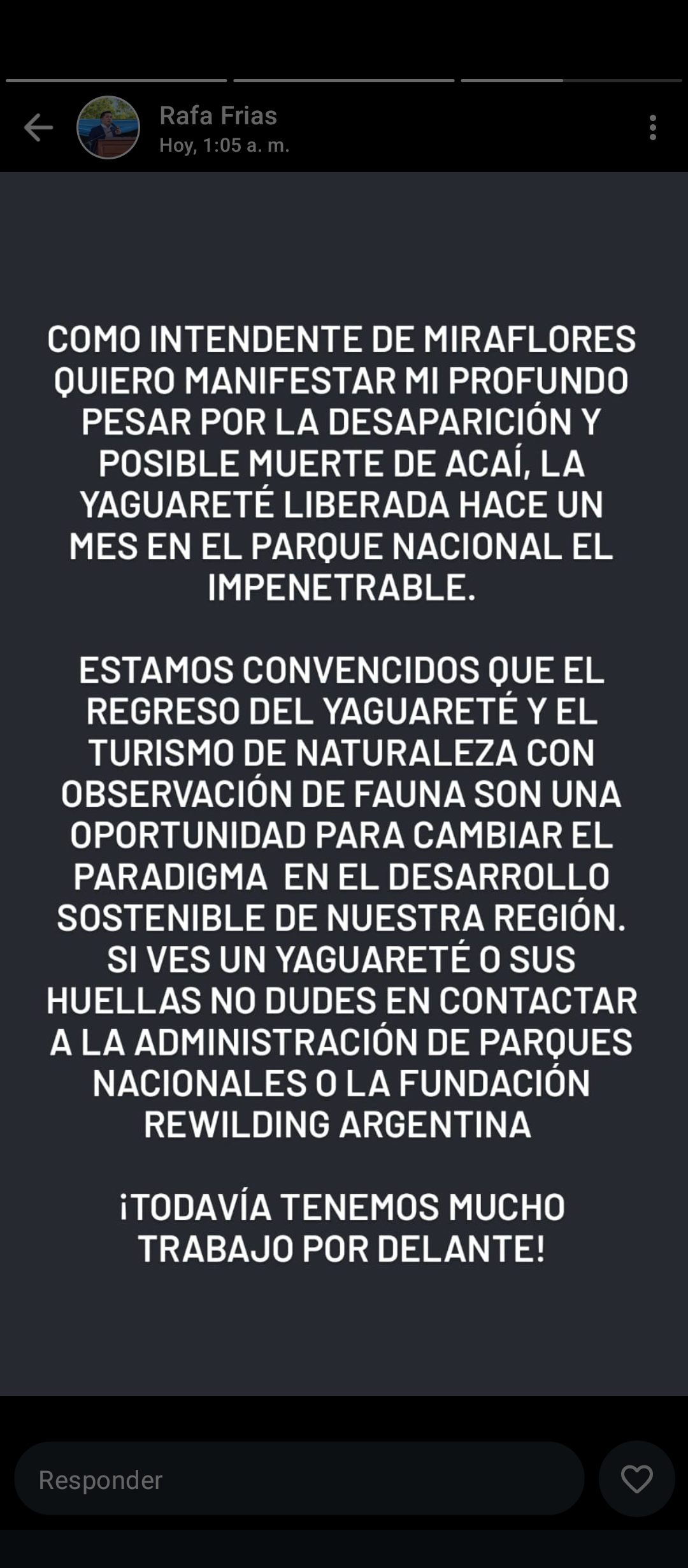 COMO INTENDENTE DE MIRAFLORES QUIERO MANIFESTAR MI PROFUNDO PESAR POR LA DESAPARICIÓN Y POSIBLE MUERTE DE ACAÍ, LA YAGUARETÉ LIBERADA HACE UN MES EN EL PARQUE NACIONAL EL IMPENETRABLE.