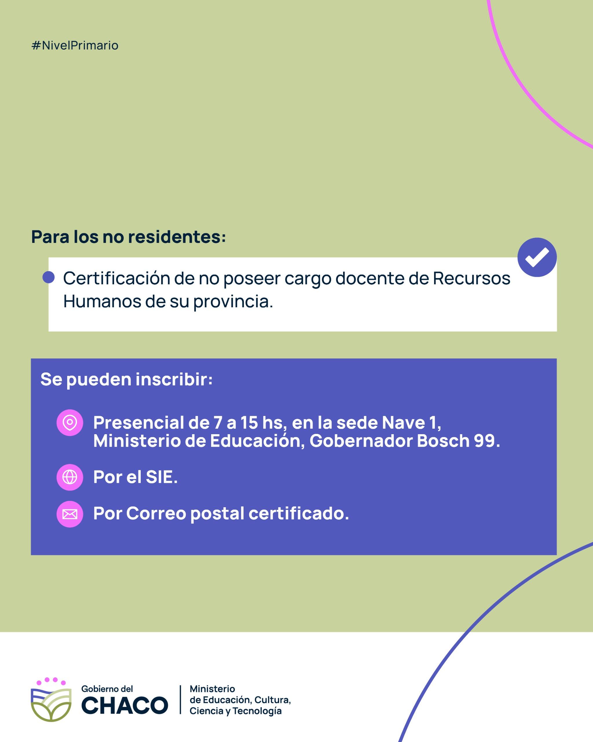 En el caso de docentes no residentes, deberán presentar certificación de no poseer cargo docente emitida por el área de Recursos Humanos de su provincia.