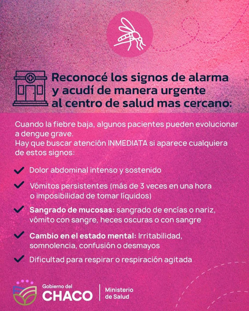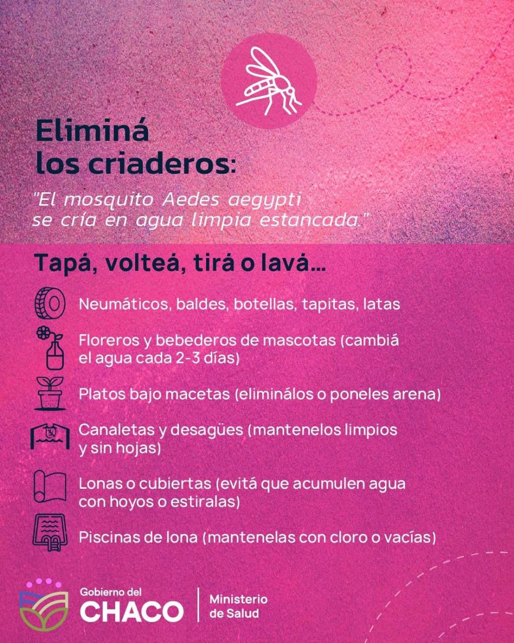 Desde la cartera sanitaria explicaron que el mosquito se reproduce en recipientes que contienen agua acumulada, por lo que es fundamental eliminar todos los posibles criaderos dentro y alrededor de las viviendas. En este sentido, remarcaron que la participación de la comunidad es clave para reducir la presencia del mosquito y prevenir posibles contagios. Entre las principales recomendaciones, se solicita a la población mantener patios y jardines desmalezados y limpios, ya que los espacios con vegetación alta o residuos pueden convertirse en lugares propicios para la presencia de mosquitos. También se aconseja destapar canaletas y desagües para permitir el correcto escurrimiento del agua de lluvia y evitar que se acumule. Otra de las medidas importantes es limpiar y cepillar con frecuencia los bebederos de animales, renovando el agua diariamente. Asimismo, se recomienda reemplazar el agua de los floreros por arena húmeda, lo que evita que el mosquito encuentre un lugar para depositar sus huevos. Desde el Ministerio también señalaron la importancia de desechar el agua acumulada en recipientes como baldes, botellas, latas, macetas, neumáticos u otros objetos que puedan retener agua. En la misma línea, se pide a la población eliminar o descartar aquellos objetos en desuso que puedan convertirse en potenciales criaderos. Las autoridades sanitarias recordaron que la eliminación de estos reservorios es una de las acciones más efectivas para disminuir la presencia del mosquito en los hogares y barrios. Por ello, insistieron en que cada vecino puede colaborar realizando estas tareas de manera periódica. Finalmente, el Ministerio de Salud reiteró que el compromiso de toda la comunidad es fundamental para prevenir enfermedades y cuidar la salud colectiva, especialmente en los meses en los que aumenta la circulación de mosquitos. *La prevención comienza en casa y con pequeñas acciones diarias es posible reducir significativamente los riesgos.*