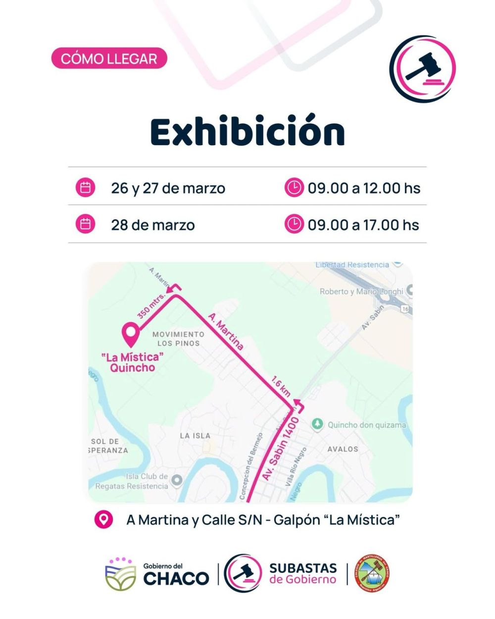 Por otra parte, se informó que los interesados podrán acceder a la exhibición previa de los bienes los días 26 y 27 de marzo, de 9:00 a 12:00 horas, y el 28 de marzo, de 9:00 a 17:00 horas, en el predio ubicado sobre avenida Martina y calle S/N, en el galpón “La Mística”.