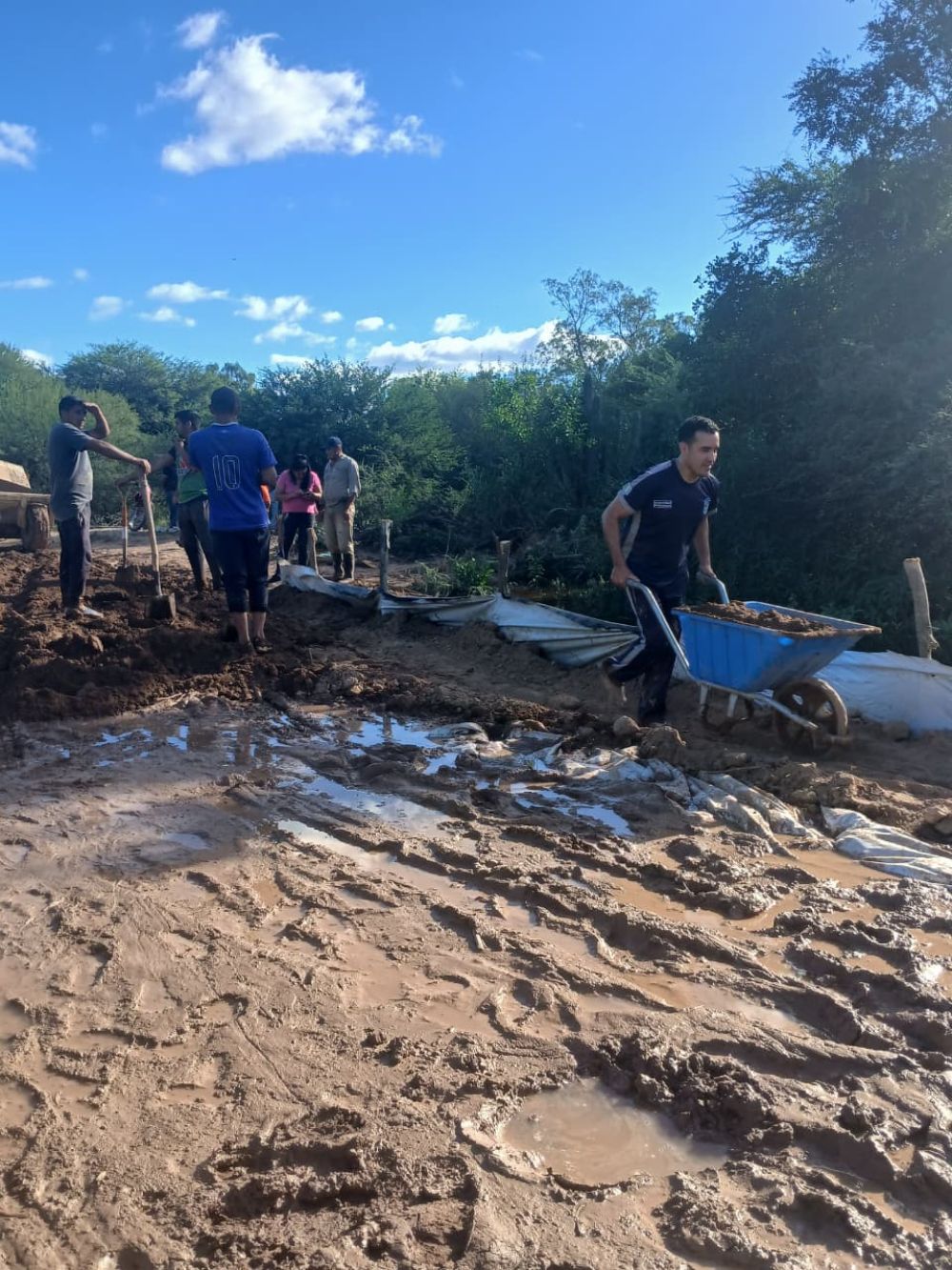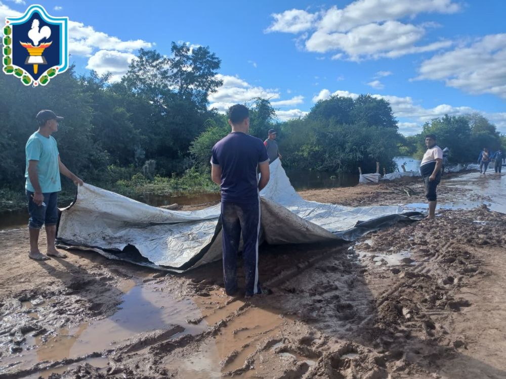 Desde las primeras horas de la tarde, personal policial junto a la Delegación Municipal y vecinos de la zona realizaron trabajos manuales de colocación de postes, plásticos y tierra removida para intentar frenar el avance del agua. La creciente ya obstaculizó el camino de tierra que conduce al puente de ingreso a la localidad.