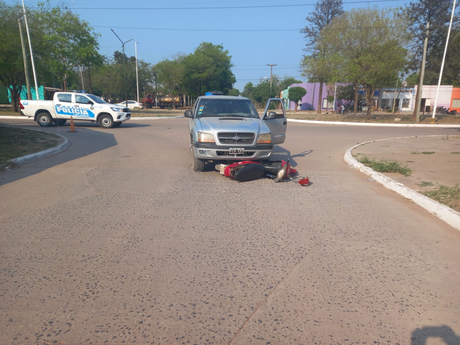 Durante la mañana de este martes 03/10 se produjo un siniestro vial entre una camioneta Chevrolet S10 y una motocicleta Marca Guerrero 110 cc en la intersección de Avenida San Martín y calle CABITO Leiva de la localidad de Miraflores.