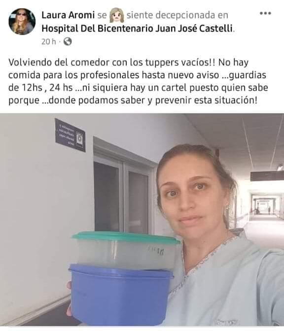 LAURA POSTEO LO SIGUIENTE “Volviendo del comedor con los tuppers vacíos!! No hay comida para los profesionales hasta nuevo aviso …guardias de 12hs , 24 hs …ni siquiera hay un cartel puesto quien sabe porque …donde podamos saber y prevenir esta situación!” Días atrás el propio director del Hospital Bicentenario Dr Felix Ruiz reconoció lo que estaba ocurriendo, falta de pago al proveedor, mientras que la JEFA DE LA CARTERA SANITARIA dijo que era una AOPERACION MEDIATICA. Fuente Pórtico Multimedios.