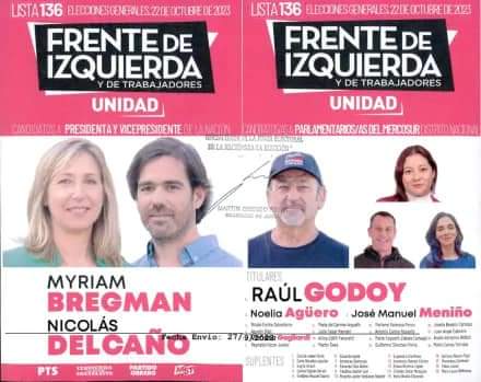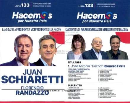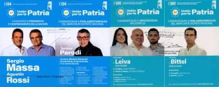 Por el oficialismo van como candidatos a presidente y vice el ministro de EconomÃa, Sergio Massa, y el jefe de Gabinete, AgustÃn Rossi, respectivamente. En las PASO, Unión por la Patria quedó en tercer lugar con el 27,28 por ciento de los sufragios.